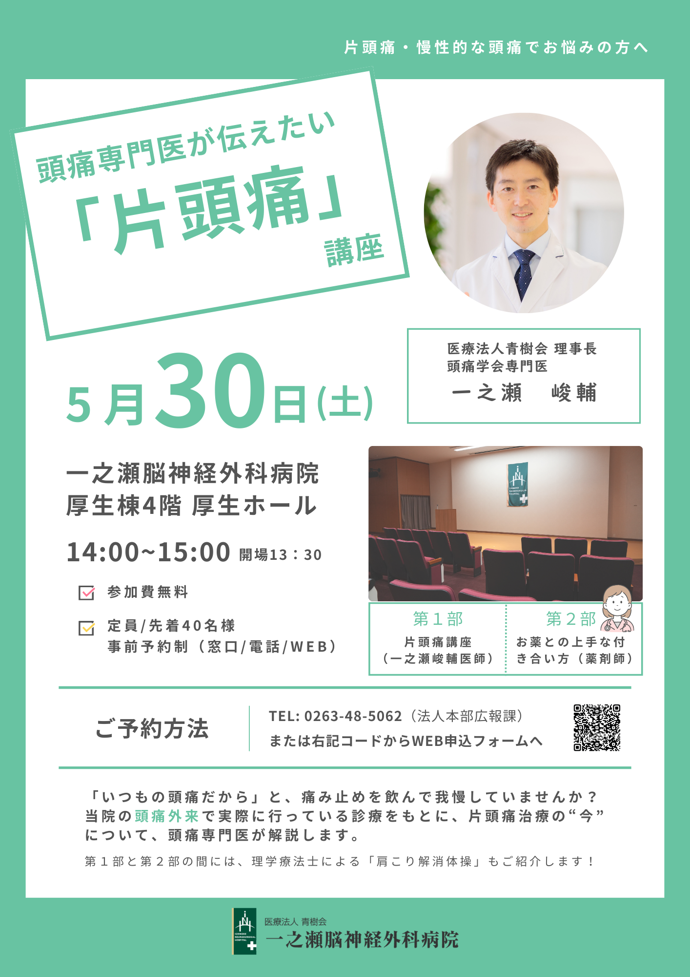 この度、『頭痛専門医が伝えたい「片頭痛」講座』を、下記のような日程で開催いたします。