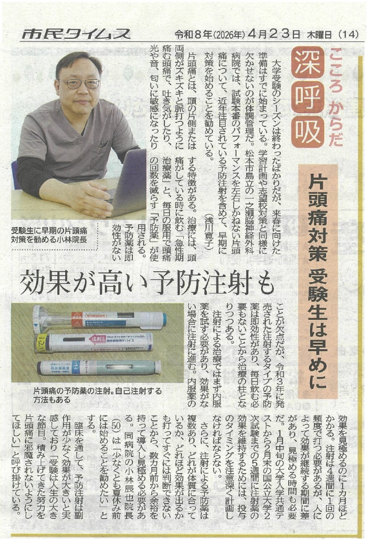 本日(2026年4月23日付)の市民タイムスにて、小林病院長による「受験生の片頭痛対策」に関する記事が掲載されました。